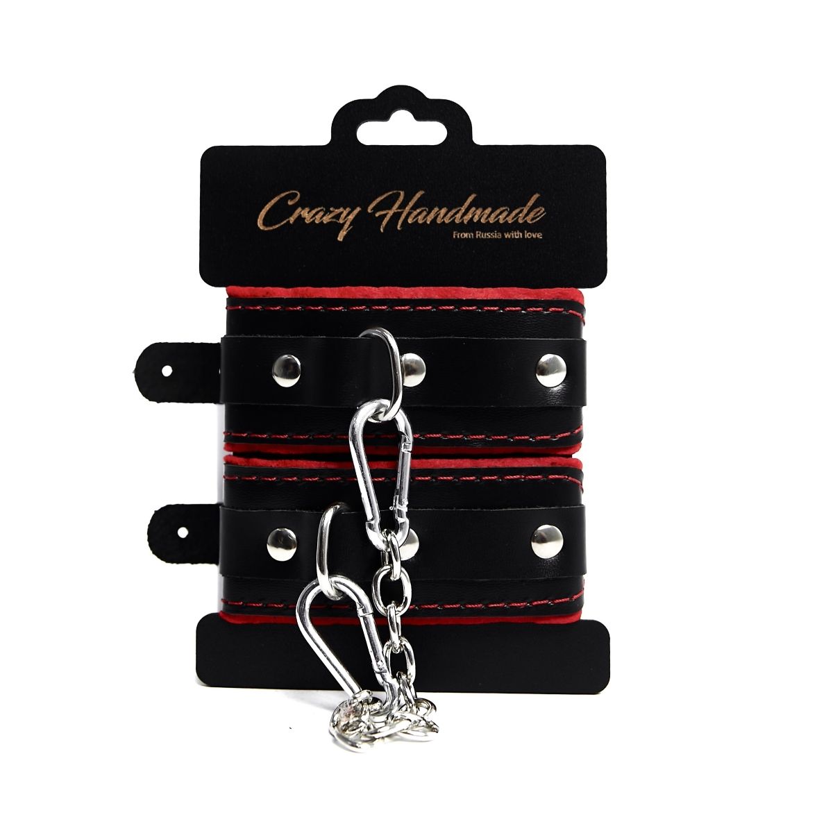 Черные наручники с красной подкладкой, строчками и скругленными ремешками.